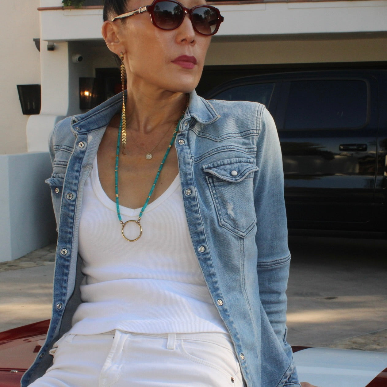 clean lines of a necklace with a simple silver circle crafted to hold glasses. Back in 1999 in the